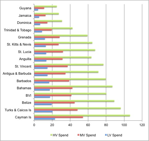 Figure 1: Monthly spend on mobile/cellular service in the select Caribbean countries as at November 2011(Source ICT Pulse)