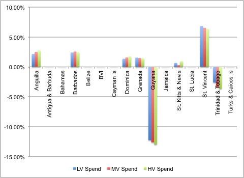 It is important to highlight that in most countries where rates changes were implemented, they were relatively small: the average person might not have realised they had occurred. However, when the amount spent per month is considered, the adjustment often becomes more apparent. For example, excluding Guyana, changes in the monthly spend ranged from as little as USD 0.08 per month in Dominica for a LV basket of service, which is arguably negligible, to USD 4.59 per month in St. Vincent and the Grenadines for a HV basket of services, which is considerably more substantial.