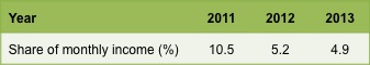 Figure 4: Comparison of share of month income consumed by an Internet plan with an advertised download speed of 2 Mbps between May 2011 and May 2013 (Source: ICT Pulse)
