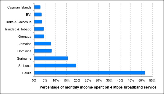 Figure 2: Share of monthly income as a percentage consumed by a 4 Mbps Internet plan in select Caribbean countries as at May 2013 (Source: ICT Pulse)