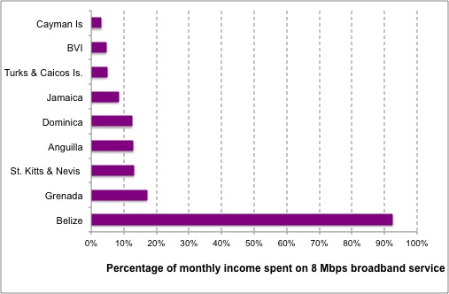 Figure 3: Portion of monthly income as a percentage consumed by an 8 Mbps Internet plan in select Caribbean countries as at May 2013 (Source: ICT Pulse)