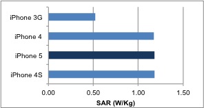 Since our last review, Apple released the iPhone 5 handset. Figure 2 presents the SAR for Apple’s most popular devices, starting with the iPhone 3G. SARs for Apple’s mobile/cellular smartphones range from 0.52 W/Kg for the iPhone 3G, to 1.18 W/Kg for the iPhone 4S and iPhone 5.
