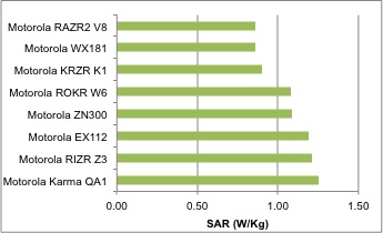 Over the past year, there does not appear to have been any major addition to the Motorola suite of handsets available in the region. Hence the devices reviewed remains unchanged, as reflected in Figure 3. The results range from 0.86 W/Kg for the RAZR V8, to 1.25 W/Kg for the Karma QA1.