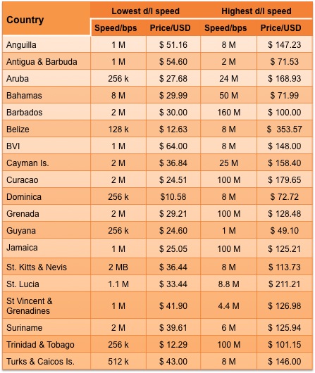 In this our 2014 review of Internet speed and spend across the Caribbean, we have widened the pool from 16 to 19, by including Aruba, Curacao and Suriname, from the Dutch Caribbean. Table 2 shows the minimum and maximum advertised download speeds available in those countries, and the corresponding best rates offered for those packages.