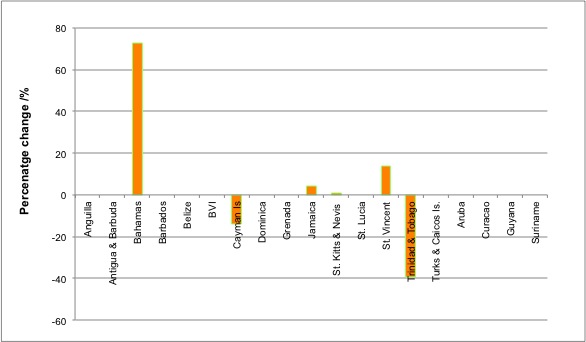Figure 3: Percentage change in monthly rates between May 2013 and May 2014 for an Internet plan with an advertised download speed of 2 Mbps in select Caribbean countries (Source: ICT Pulse)