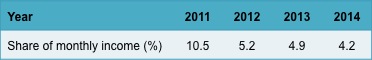 Figure 4: Comparison of share of month income consumed by an Internet plan with an advertised download speed of 2 Mbps between May 2012 and May 2014 (Source: ICT Pulse)