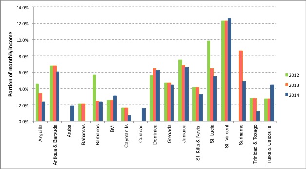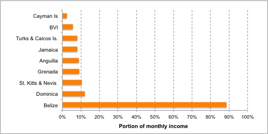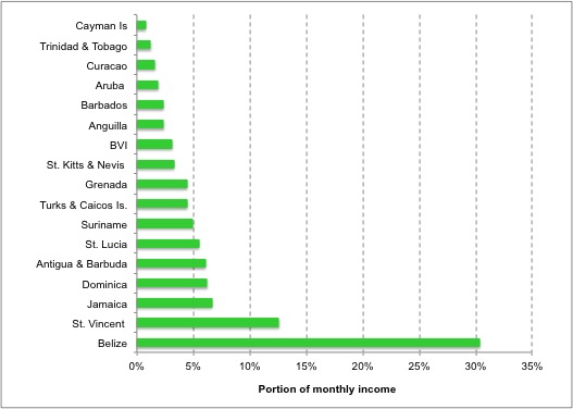 The incomes also can be expressed in purchasing power parity (PPP) a common denominator, so to speak to really show the comparative impact from island to island. Jamaica, for example, using PPP may result in a higher % of income than expressed here due to their exchange rate and purchasing power of the dollar. PPP attempts to bring all the currencies on an even keel