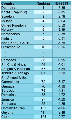 The following Caribbean countries were included in the 2013 IDI exercise: Antigua and Barbuda; Barbados; Cuba; Dominica; Dominican Republic; Grenada; Guyana; Jamaica; Saint Kitts and Nevis; Saint Lucia; St. Vincent & the Grenadines; Suriname; and Trinidad & Tobago. Their 2013 IDI ranking and scores are shown in Table 1.