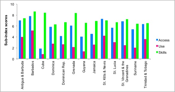 Figure 2: IDI sub-indices scores for select Caribbean countries as of 2013 (Source: ITU)