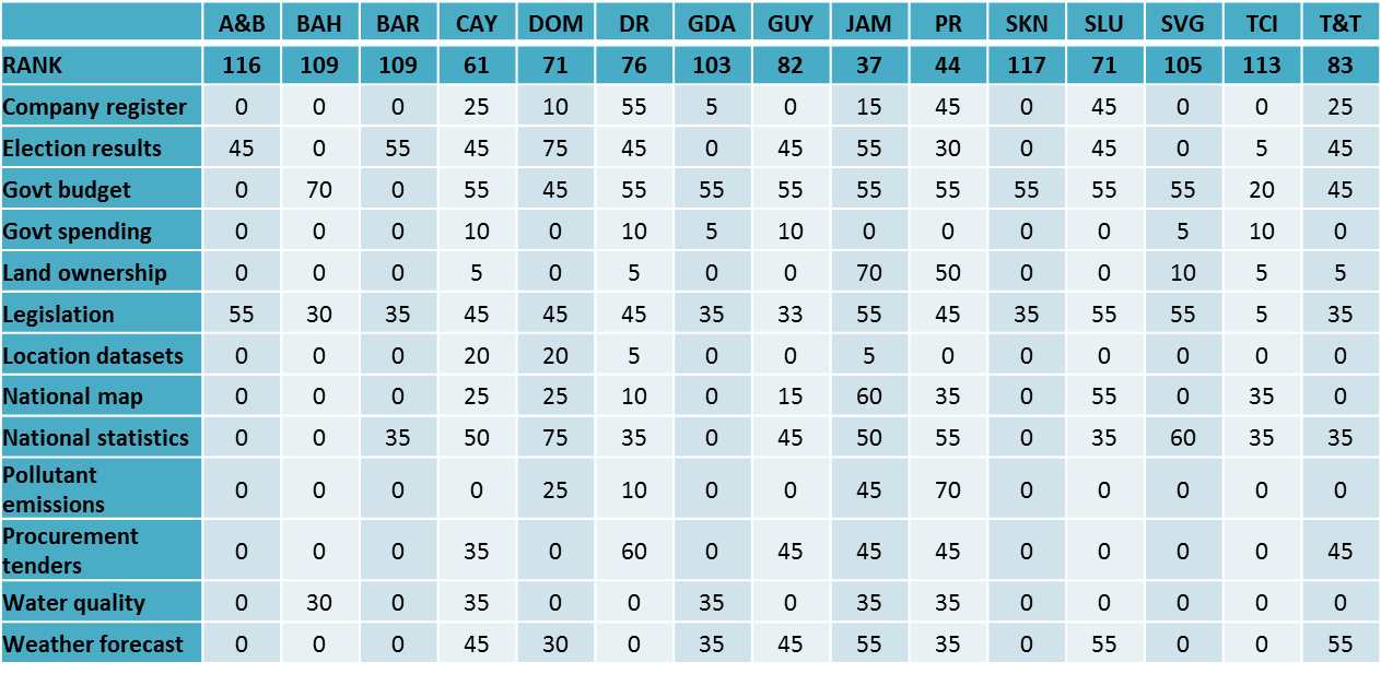 Summary of the Caribbean results in the 2015 Global Open Data Index exercise.