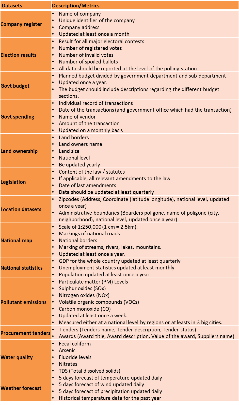Table 1: Datasets examined for 2015 Global Open Data Index (Souce: Global Open Data Index)